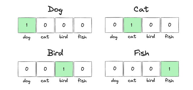 Let’s consider a set of four words: dog, cat, bird, and fish. Using One-Hot Encoding, these words would be represented as follows: