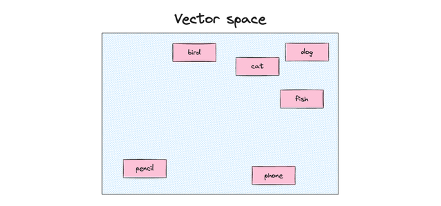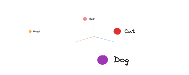 In the example above, "dog" and "cat" appear close to each other in the vector space, because both are pets and share contextual similarities. On the other hand, "car" and "forest" are positioned farther away due to their very different meanings and usage patterns.