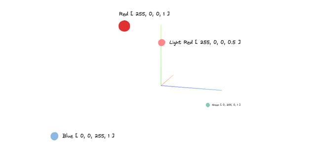 Since we can’t visualize four dimensions directly, we simplify by plotting just the RGB components in a 3D space. The alpha value still exists, but isn't represented visually in this view.